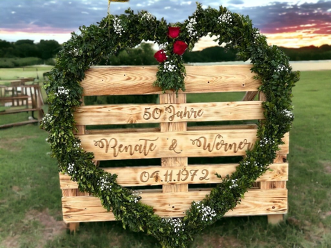 Das Besondere: Die Holzfläche kann individuell nach Ihren Wünschen beschriftet werden – zum Beispiel mit Namen, Daten oder persönlichen Botschaften. So entsteht ein ganz persönliches Erinnerungsstück, das nicht nur am Festtag begeistert, sondern auch als Dekoration im Garten oder Zuhause weiterverwendet werden kann.